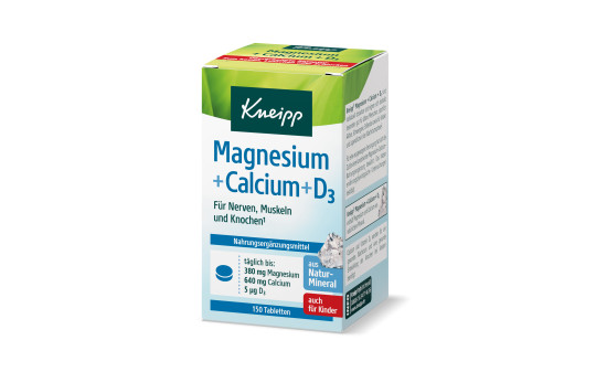 Kneipp® Magnesium + Calcium + D3 enthält reines Magnesium und Calcium aus natürlichem Mineral. Kneipp® Magnesium+Calcium+D3 sind individuell dosierbar und eignen sich deshalb besonders gut für ältere Menschen, sportlich Aktive, Schwangere, Stillende sowie für Kinder und Jugendliche in der Wachstumsphase. Für eine optimale Versorgung hat sich die Zufuhr einer kombinierten Magnesium-Calcium-Nahrungsergänzung bewährt. Das haben ernährungsphysiologische Untersuchungen bestätigt. Magnesium trägt zu einer normalen Funktion der Muskeln und des Nervensystems bei. Calcium wird zur Erhaltung normaler Knochen benötigt; dazu tragen auch Magnesium und Vitamin D3 bei.