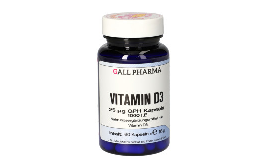 Vitamin D3 (auch Colecalciferol genannt) gehört zur Gruppe der fettlöslichen Vitamine. Es nimmt eine Sonderstellung unter den Vitaminen ein, da es in der Haut mit Hilfe von UV-B-Strahlen des Sonnenlichts gebildet werden kann. Oft reicht die Sonneneinstrahlung während der Herbst- und Wintermonate nicht aus, um eine optimale Versorgung zu sichern. Zudem ist Vitamin D nur begrenzt speicherbar. Daher ist eine regelmäßige Ergänzung der Nahrung besonders in der sonnenarmen Zeit sinnvoll. Vitamin D3 fördert die Bildung und Reifung der Knochenstammzellen. Außerdem regelt es die Aufnahme von Kalzium und fördert den Einbau von Kalzium und Phosphat in Knochen und Zähnen (Mineralisation), dadurch werden diese hart und gestärkt. Eine Nahrungsergänzung mit Vitamin D3 25 µg GPH Kapseln kann bei mangelndem Aufenthalt in der Sonne, im Winter, für Schwangere und ältere Menschen sinnvoll sein.