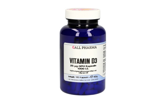 Vitamin D3 (auch Colecalciferol genannt) gehört zur Gruppe der fettlöslichen Vitamine. Es nimmt eine Sonderstellung unter den Vitaminen ein, da es in der Haut mit Hilfe von UV-B-Strahlen des Sonnenlichts gebildet werden kann. Oft reicht die Sonneneinstrahlung während der Herbst- und Wintermonate nicht aus, um eine optimale Versorgung zu sichern. Zudem ist Vitamin D nur begrenzt speicherbar. Daher ist eine regelmäßige Ergänzung der Nahrung besonders in der sonnenarmen Zeit sinnvoll. Vitamin D3 fördert die Bildung und Reifung der Knochenstammzellen. Außerdem regelt es die Aufnahme von Kalzium und fördert den Einbau von Kalzium und Phosphat in Knochen und Zähnen (Mineralisation), dadurch werden diese hart und gestärkt. Eine Nahrungsergänzung mit Vitamin D3 25 µg GPH Kapseln kann bei mangelndem Aufenthalt in der Sonne, im Winter, für Schwangere und ältere Menschen sinnvoll sein.