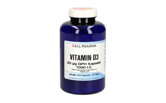 Vitamin D3 (auch Colecalciferol genannt) gehört zur Gruppe der fettlöslichen Vitamine. Es nimmt eine Sonderstellung unter den Vitaminen ein, da es in der Haut mit Hilfe von UV-B-Strahlen des Sonnenlichts gebildet werden kann. Oft reicht die Sonneneinstrahlung während der Herbst- und Wintermonate nicht aus, um eine optimale Versorgung zu sichern. Zudem ist Vitamin D nur begrenzt speicherbar. Daher ist eine regelmäßige Ergänzung der Nahrung besonders in der sonnenarmen Zeit sinnvoll. Vitamin D3 fördert die Bildung und Reifung der Knochenstammzellen. Außerdem regelt es die Aufnahme von Kalzium und fördert den Einbau von Kalzium und Phosphat in Knochen und Zähnen (Mineralisation), dadurch werden diese hart und gestärkt. Eine Nahrungsergänzung mit Vitamin D3 25 µg GPH Kapseln kann bei mangelndem Aufenthalt in der Sonne, im Winter, für Schwangere und ältere Menschen sinnvoll sein.