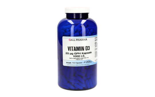 Vitamin D3 (auch Colecalciferol genannt) gehört zur Gruppe der fettlöslichen Vitamine. Es nimmt eine Sonderstellung unter den Vitaminen ein, da es in der Haut mit Hilfe von UV-B-Strahlen des Sonnenlichts gebildet werden kann. Oft reicht die Sonneneinstrahlung während der Herbst- und Wintermonate nicht aus, um eine optimale Versorgung zu sichern. Zudem ist Vitamin D nur begrenzt speicherbar. Daher ist eine regelmäßige Ergänzung der Nahrung besonders in der sonnenarmen Zeit sinnvoll. Vitamin D3 fördert die Bildung und Reifung der Knochenstammzellen. Außerdem regelt es die Aufnahme von Kalzium und fördert den Einbau von Kalzium und Phosphat in Knochen und Zähnen (Mineralisation), dadurch werden diese hart und gestärkt. Eine Nahrungsergänzung mit Vitamin D3 25 µg GPH Kapseln kann bei mangelndem Aufenthalt in der Sonne, im Winter, für Schwangere und ältere Menschen sinnvoll sein.