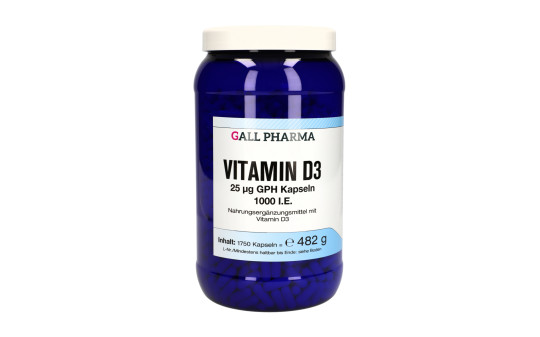 Vitamin D3 (auch Colecalciferol genannt) gehört zur Gruppe der fettlöslichen Vitamine. Es nimmt eine Sonderstellung unter den Vitaminen ein, da es in der Haut mit Hilfe von UV-B-Strahlen des Sonnenlichts gebildet werden kann. Oft reicht die Sonneneinstrahlung während der Herbst- und Wintermonate nicht aus, um eine optimale Versorgung zu sichern. Zudem ist Vitamin D nur begrenzt speicherbar. Daher ist eine regelmäßige Ergänzung der Nahrung besonders in der sonnenarmen Zeit sinnvoll. Vitamin D3 fördert die Bildung und Reifung der Knochenstammzellen. Außerdem regelt es die Aufnahme von Kalzium und fördert den Einbau von Kalzium und Phosphat in Knochen und Zähnen (Mineralisation), dadurch werden diese hart und gestärkt. Eine Nahrungsergänzung mit Vitamin D3 25 µg GPH Kapseln kann bei mangelndem Aufenthalt in der Sonne, im Winter, für Schwangere und ältere Menschen sinnvoll sein.